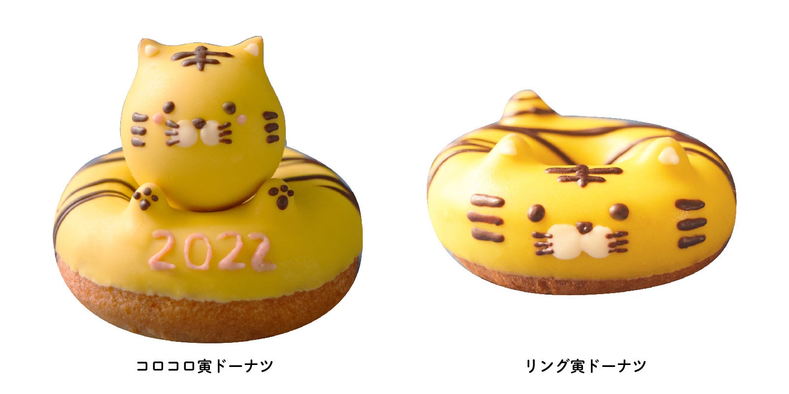 つぶらな瞳と、ちょこんと出された前足が愛くるしいコロコロ寅ドーナツに、しっぽまでシマシマのかわいいリング寅ドーナツは、かぼちゃチョコレートを使用して自然な甘さで仕上げています。
