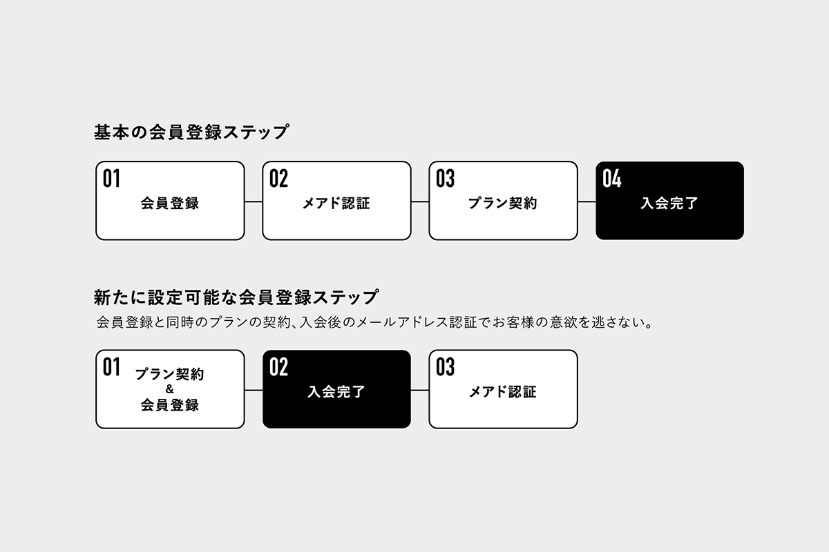 3.入会導線の迅速化:新規会員登録とプラン契約を促進するため、未会員ユーザーにもプラン契約導線を表示することができます。また、メールアドレス認証をスキップして契約完了することができ、途中離脱や認証メール不着による機会損失を防止します。