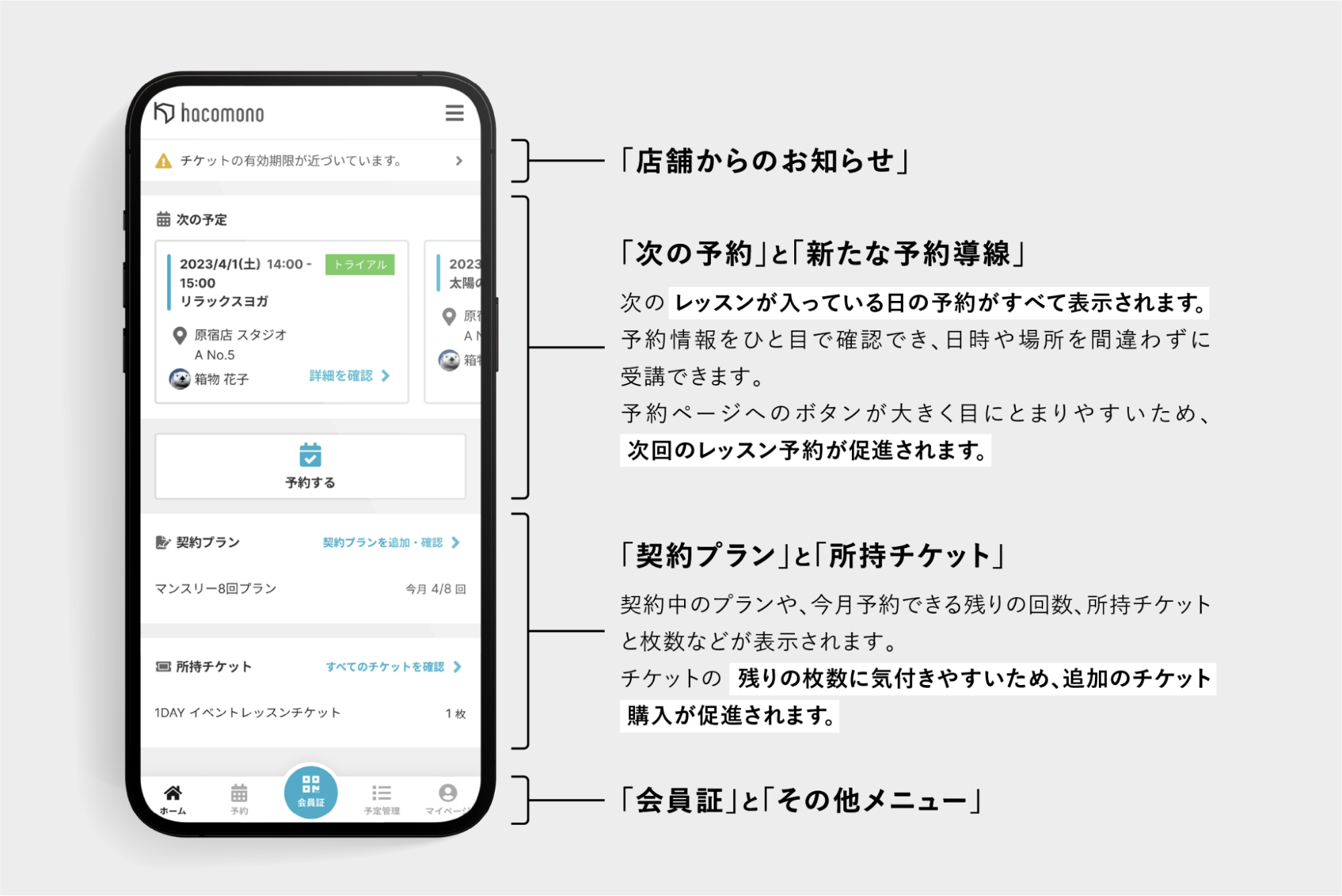 1.ユーザーへの情報提供の利便性向上:ホーム画面が新設され、店舗スタッフに問い合わせをしなくても契約プランや所持チケットなどの情報をユーザー自身が即座に確認できるようになりました。また、下部にある共通ナビゲーションメニューは、管理サイトからカスタマイズできる機能が加わりました。
