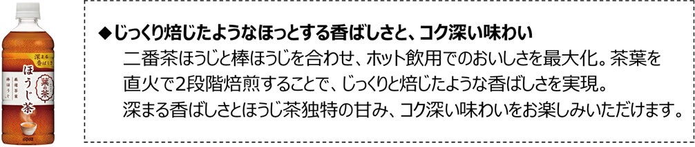 「葉の茶 ほうじ茶 ホット&コールド」は、直火でじっくり2段階焙煎した、二番茶ほうじと棒ほうじを合わせることで、口に含んだ瞬間から香るじっくり焙じたような香ばしさを実現。深まる香ばしさとほうじ茶独特の甘み、コク深い味わいをホットでお楽しみいただけます。