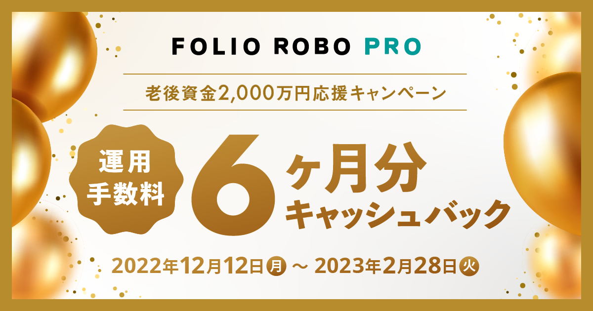 株式会社FOLIO(本社:東京都千代田区、代表取締役CEO:甲斐 真一郎、以下FOLIO)が提供している、相場を先読みするAI投資ROBO PROは、2023年1月に公開から3周年を迎えることを記念して、期間中にROBO PROを新規契約・積立設定をした方が適用条件を満たす場合に最大10万円(運用手数料3か月分)をキャッシュバックする『ROBO PRO 3周年キャンペーン』と、老後資金2000万円を目標に運用する方を応援するため、期間中にROBO PROを新規契約・積立設定をした方が購入金額200万円以上等の適用条件を満たす場合に6ヶ月分の運用手数料をキャッシュバックする『老後資金2,000万円応援キャンペーン』を実施することをお知らせいたします。