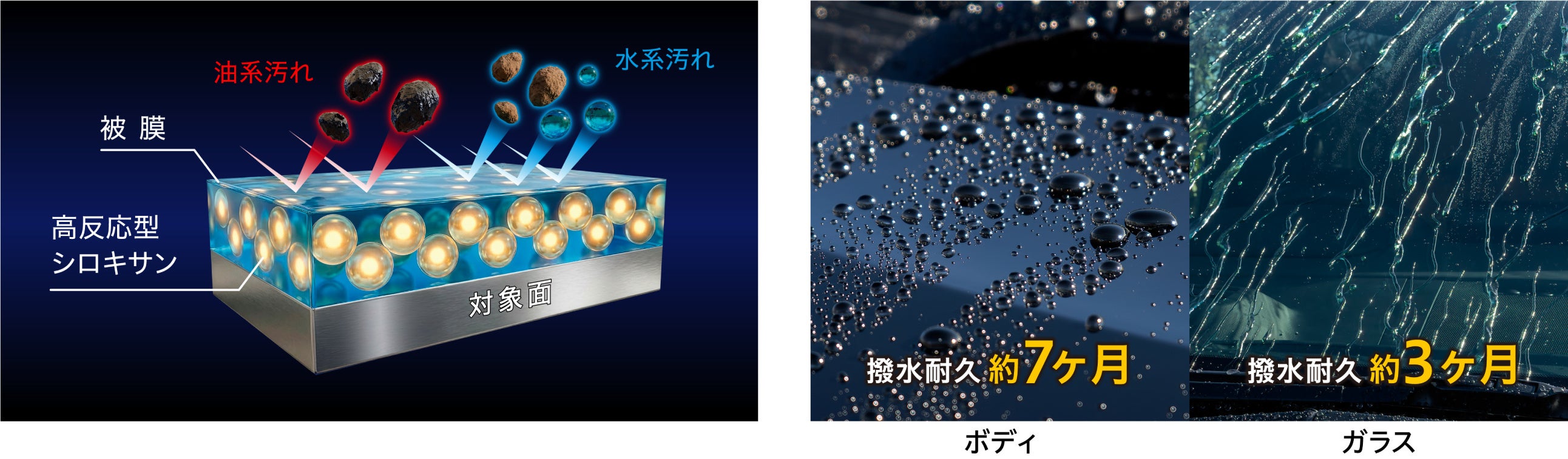プロコーティングにも採用される多様な「高反応型シロキサン」を贅沢に配合、ボディ・ガラスと反応し強固に結合することで、水玉がスルスルと滑落する高い撥水性能をボディ約7ヶ月※、ガラス約3ヶ月※の長期にわたって持続。ピッチやタールなどの油汚れも防止し、いつまでも愛車の美しい状態を維持します。