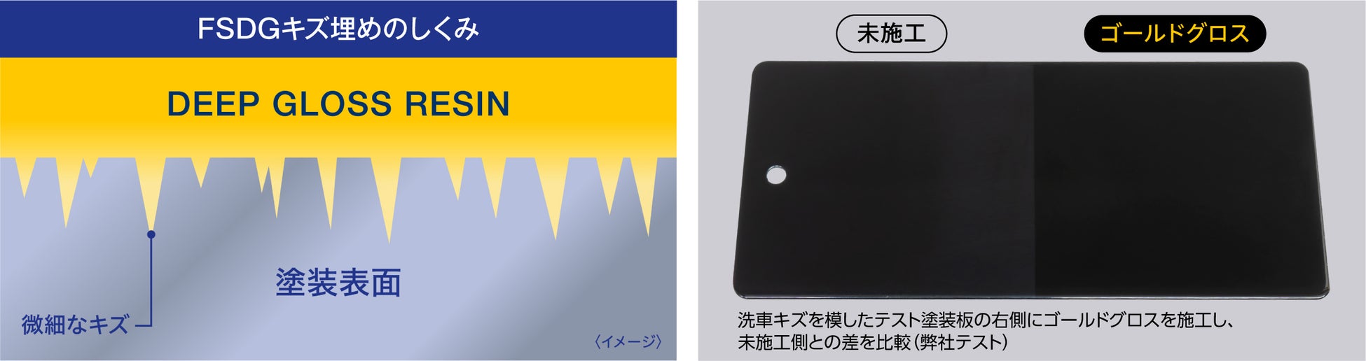 洗車キズなどボディ表面の微細なスクラッチを、極限まで深い艶出し効果を追求した新開発樹脂「DEEP GLOSS RESIN」で埋めるメカニズムで、艶・光沢性・スリック性をより引き上げます。