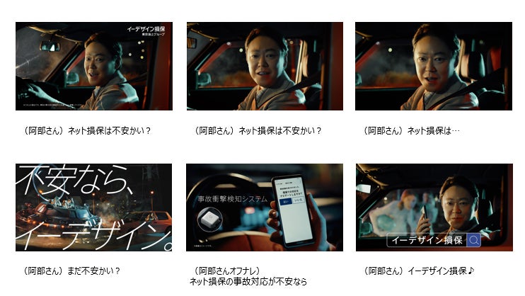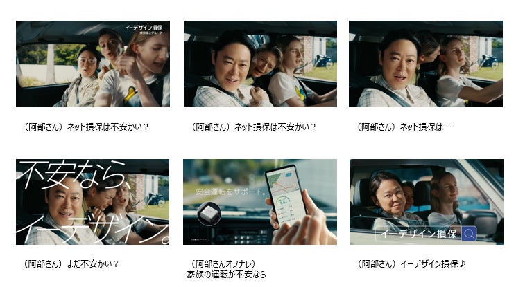 イーデザイン損害保険株式会社(本社:東京都新宿区、取締役社長:桑原 茂雄、以下「イーデザイン損保」)は、俳優の阿部サダヲさんを起用した新CM「事故衝撃検知システム」篇、「見積もりドクター」篇、「アプリで安全運転サポート」篇を2024年6月20日(木)よりWebで公開いたします。また、 「事故衝撃検知システム」篇、 「見積もりドクター」篇は7月1日(月)以降TVでも全国で放映予定です。