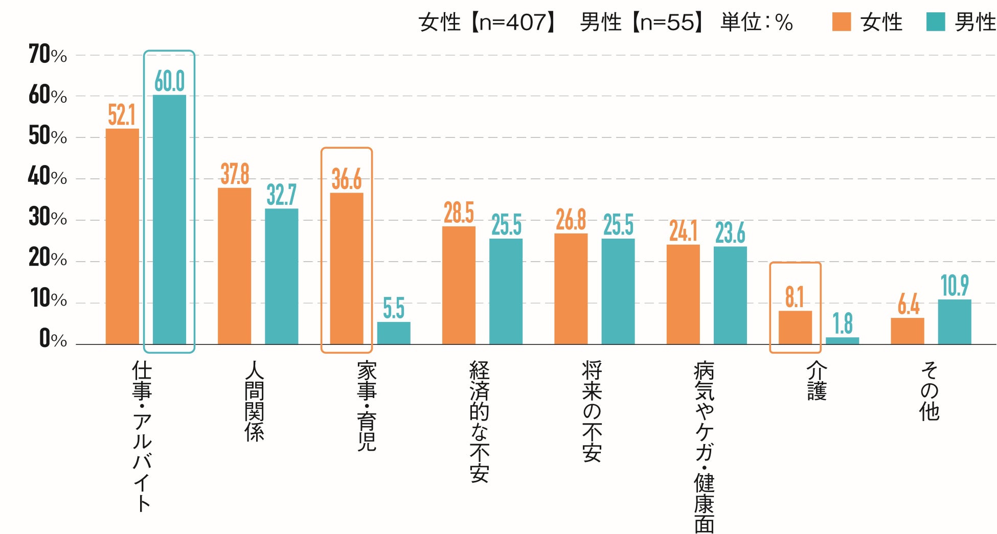 ストレスの原因については、男性は「仕事」(60.9%)が中心であったのに対し、女性は「仕事」(54.9%)に加え、「家事・育児」(43.5%)や「介護」(28.3%)など、家庭内での役割も重なっていることから、複合的な役割負担がストレスの主因となっていることが明らかとなった。