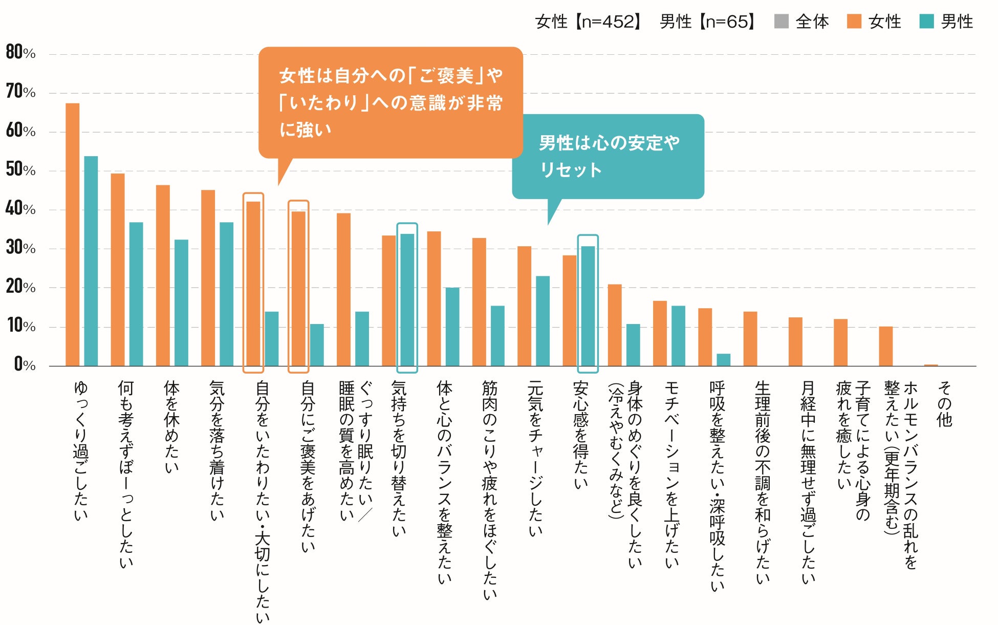 こうした“休息の目的”の違いは、消費行動にも直結しており、女性の「チル消費(癒し・ご褒美系消費)」は今後の消費市場における成長領域として注目されます。
