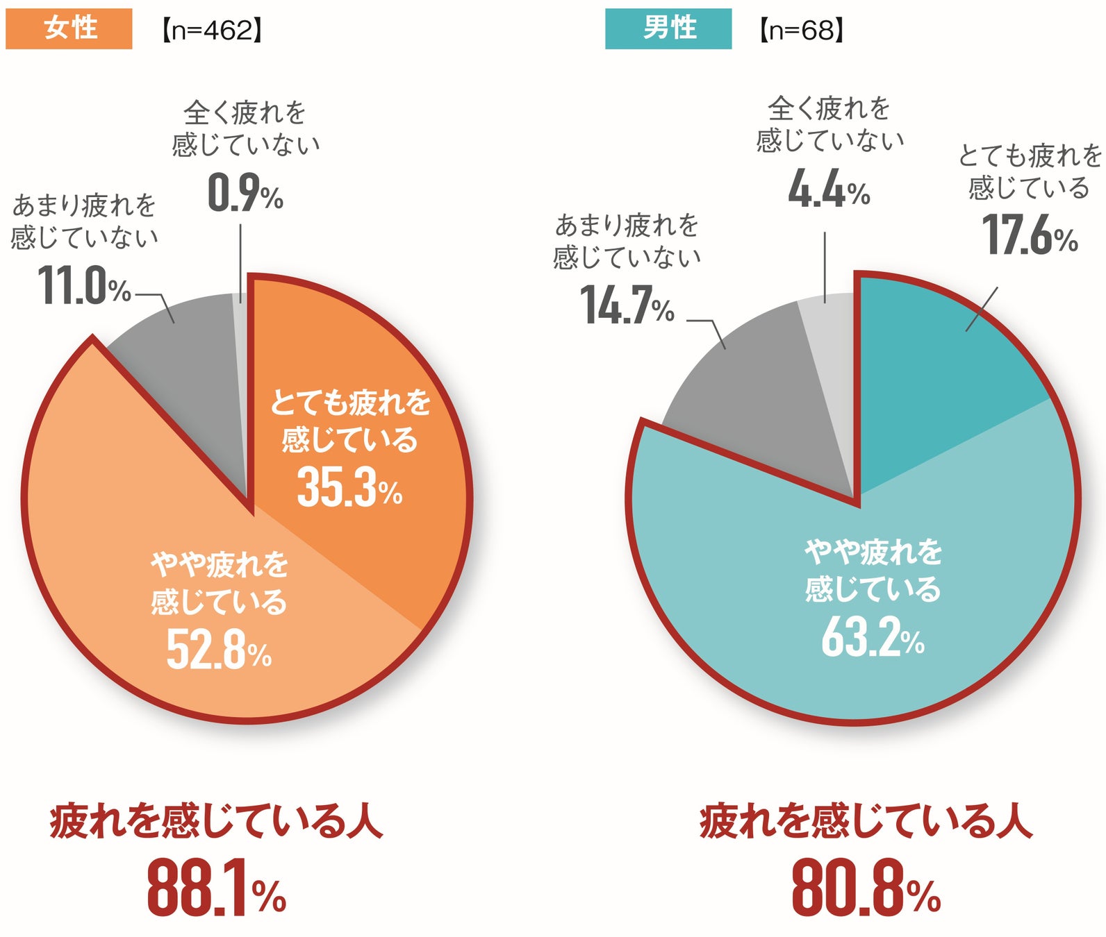 女性の88.1%、男性の80.8%が「日常的に疲れを感じている」と回答し、特に「とても疲れている」と答えた割合は女性35.3%、男性17.6%と、女性の方が深刻な疲労を抱えていることが浮き彫りとなった。