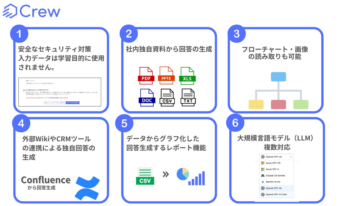 「Crew」は、ChatGPTをビジネスで安全に利用するプラットフォームです。センシティブ情報の検出、従業員の権限管理、そして社内文書に基づく会話支援を提供し、業務効率の向上をサポートします。