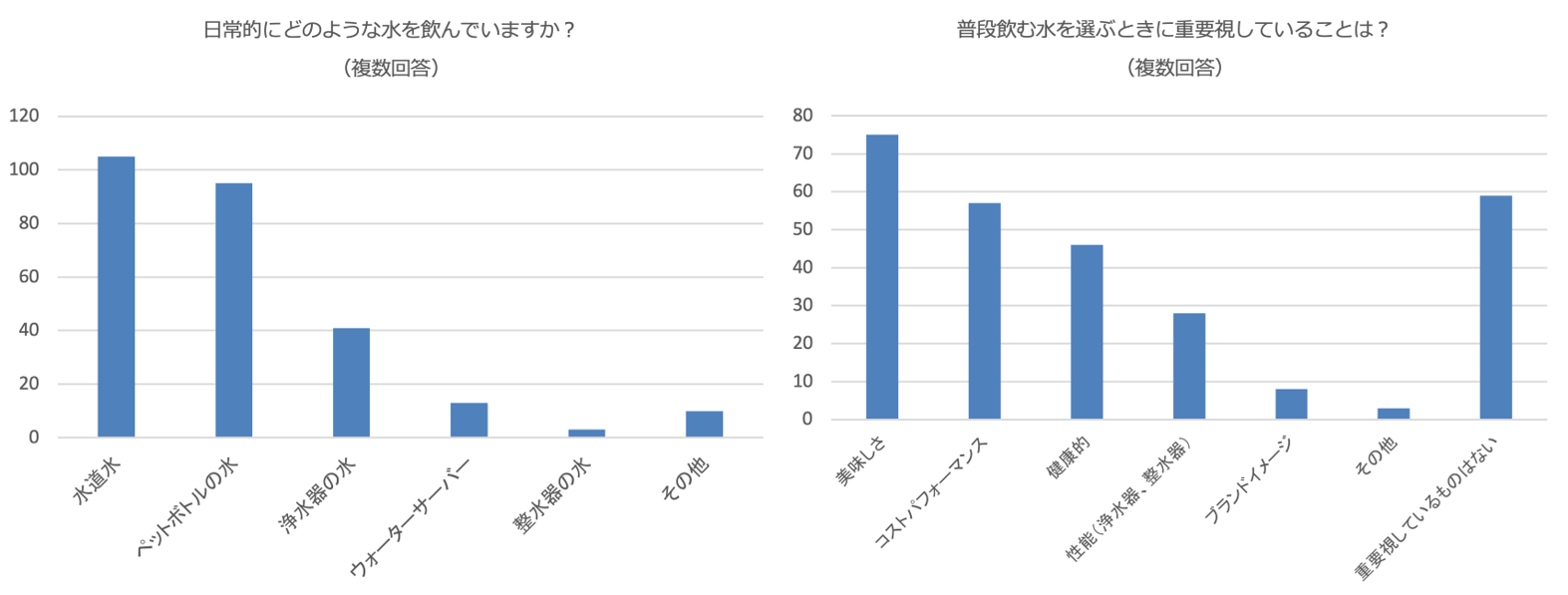 さらに、飲用水を選ぶ際に重要視していることについては、1位が美味しさ(37.5%)、2位がコストパフォーマンス(28.5%)、3位が健康的(23%)となっており、コスパよりも美味しさを重視していたり、健康を意識している人も比較的多いという結果がわかりました。