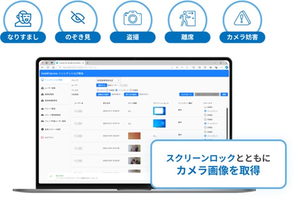 「まもりも」はAIがリモートワーク環境を見守ります。AIがPCのカメラ画像から、なりすましやのぞき見、盗撮、離席、カメラ妨害を検知すると、スクリーンロックとカメラ画像取得を実施します。既存のWeb会議システムともPCカメラを共用可能なため、新しい機材の追加や設定変更などの手間をかけずに運用できます。