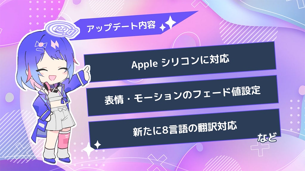 Apple シリコンへの対応や、表情・モーションのフェード値設定、新たに8言語の翻訳対応など、より多くのユーザーがLive2D表現を楽しめる新機能を追加