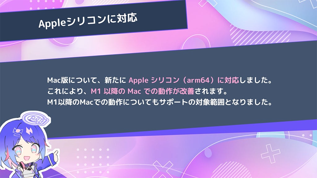 これにより、M1 以降の Mac での動作が改善されます。また、M1以降のMacでの動作についてもサポートの対象範囲となりました。