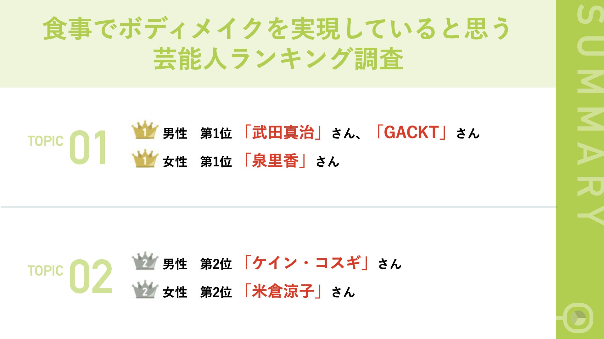 最後に、食事でボディメイクを実現していると思う芸能人を伺うと、男性芸能人の第1位に輝いたのは同率で「武田真治さん」と「GACKTさん」、女性芸能人で第1位に輝いたのは「泉里香さん」という結果になりました。