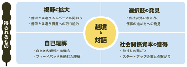 普段の業務(ホーム)と違う業務(アウェイ)を行き来することは、文化風土や制度などの違いに気付き、自社理解および自己理解が促されます。さらに、異なる業界の風習や従来のやり方が通用しない経験に葛藤することで、視座が高く、視野が広くなり、より活躍できる人財へ自ら変わっていくことも狙っています。