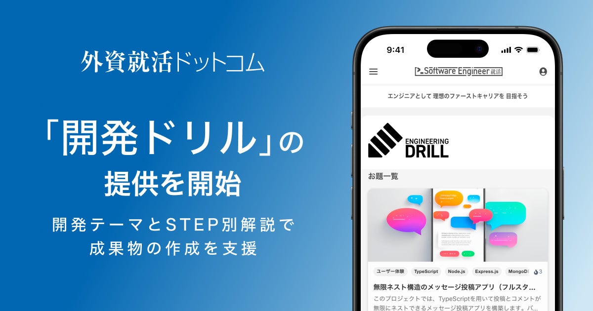 「世界で挑戦できる人材を育み、未来を創る」を掲げ、ユーザーファーストを追求したキャリアプラットフォーム「外資就活ドットコム」を運営する株式会社ハウテレビジョン(東京都港区、代表取締役:音成洋介)は、エンジニア志望の学生向けに、プロダクト開発やポートフォリオ作成を支援する「開発ドリル」機能の提供を開始します。
