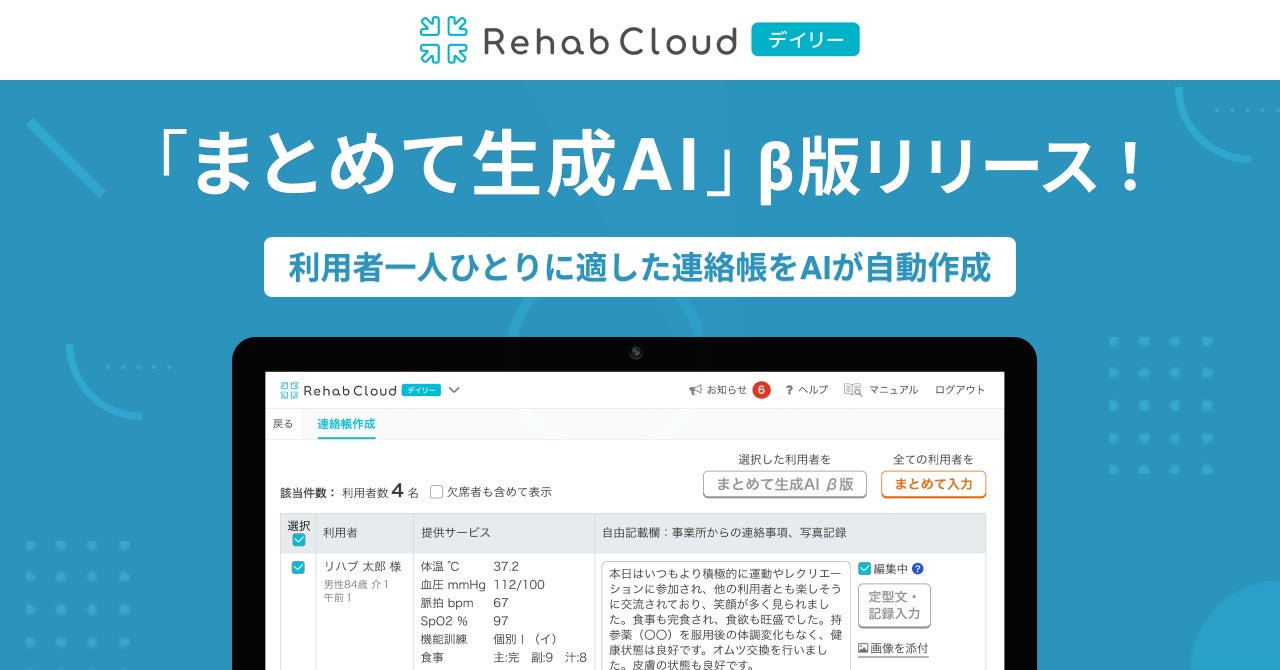 科学的介護ソフト「Rehab Cloud(リハブクラウド)」を運営する株式会社Rehab for JAPAN(本社:東京都千代田区、代表取締役:大久保 亮 以下「当社」)は、生成AIによる連絡帳作成機能「まとめて生成AI β版」をリリースいたしました。
