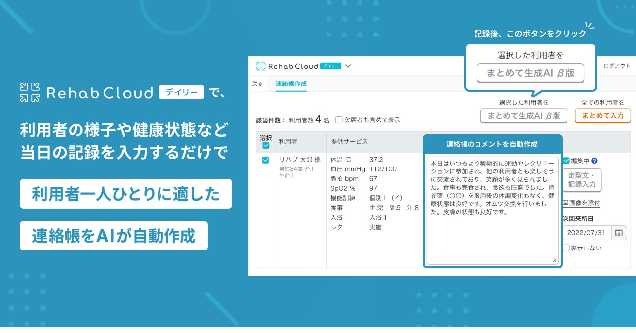 介護リハビリテックのRehab、連絡帳自動作成機能「連絡帳まとめて生成AI β版」をリリース