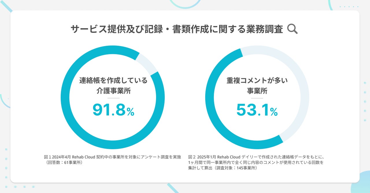 連絡帳は、介護事業所において、利用者様の様子や健康状態、活動の内容をご利用者のご家族に伝えるために作成される重要なコミュニケーションツールです。実際、通所介護事業所の約9割が連絡帳を作成しています。(図1)しかし、連絡帳の作成において、ご利用者一人ひとりの状況を把握し、適切な内容を記載するために多くの時間と労力が必要です。実際に、連絡帳を作成している事業所のうち、約5割の事業所が他の利用者と重複したコメントを記載していることが明らかになりました。(図2)これは、介護職員が連絡帳をご利用者のご家族にお渡しする大切なものであると認識しているものの、通所介護のプログラム終了後から退所前まで、という限られた時間内に作成しなければならないため、効率性が強く求められる結果だと考えられます。また、ご利用者一人ひとりに状況に寄り添った連絡帳を作成しようとすると、作業時間が大幅に増加し、現場の負担となることが課題となっています。