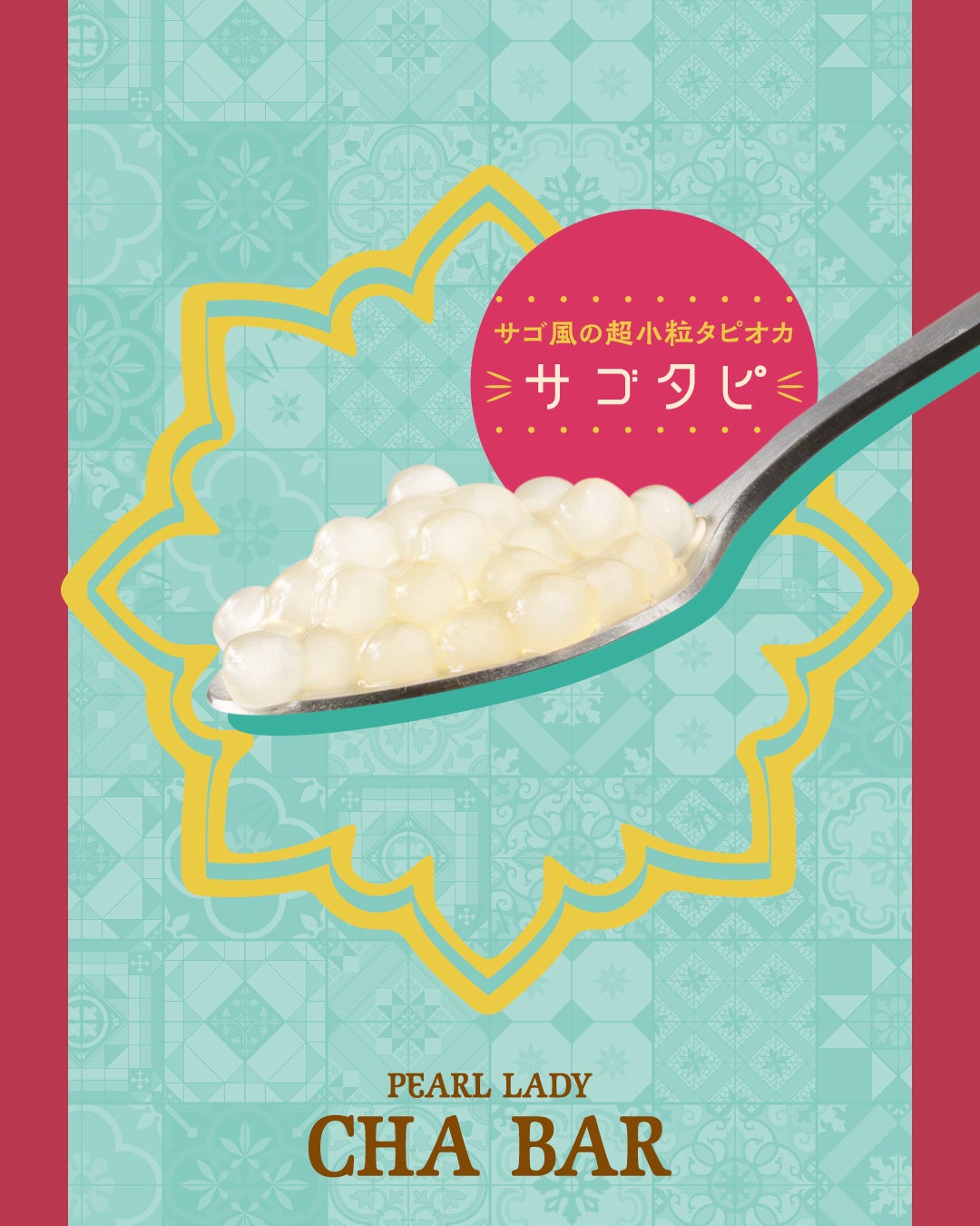 サゴヤシ澱粉を粒状にした「サゴ」をイメージした、国内工場の自家製超小粒タピオカ「サゴタピ」。