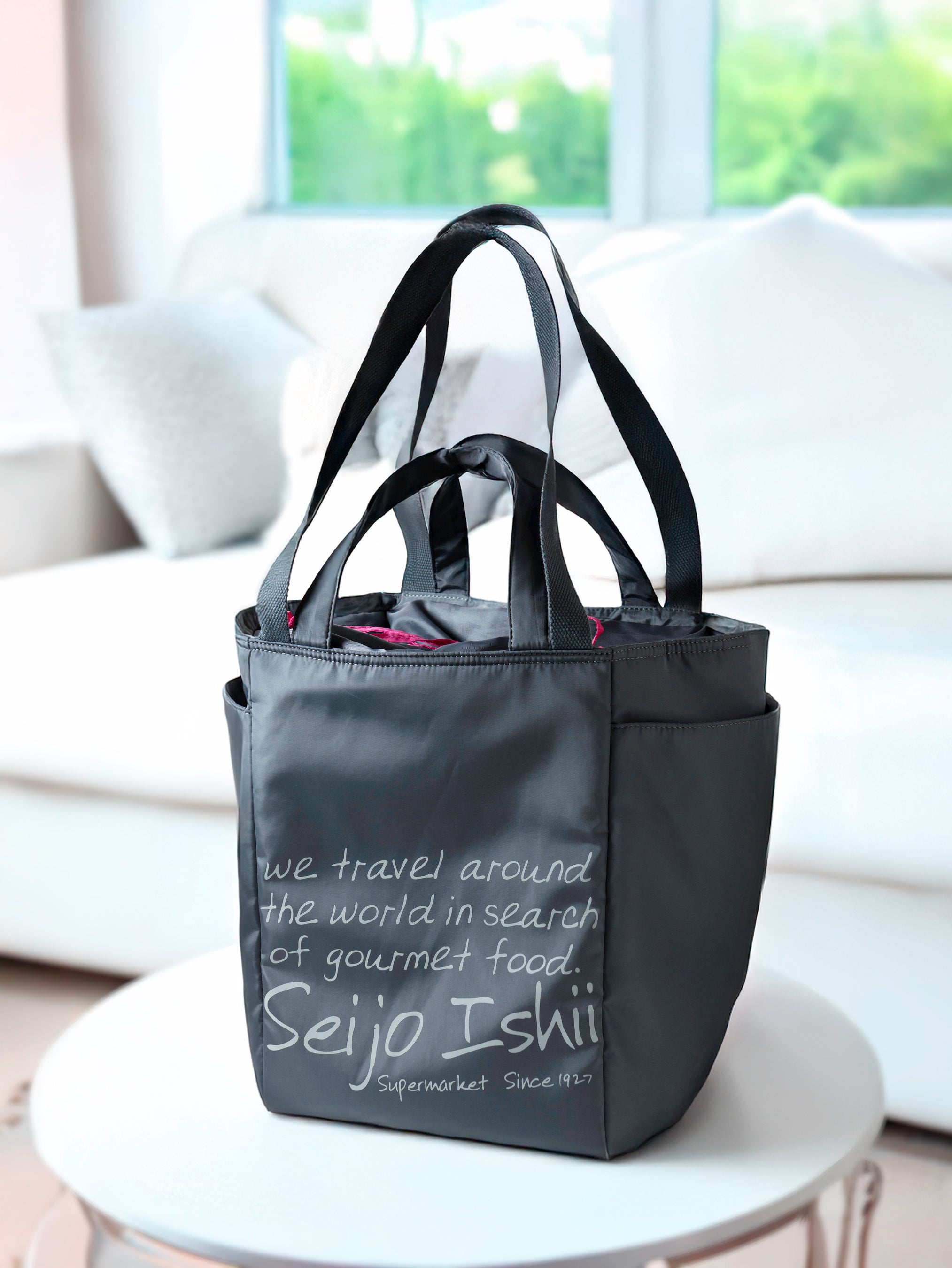 第2期の入会特典として、今回は大容量で多機能な会員限定オリジナル保冷バッグをご用意。使いやすく汚れの目立たないグレーカラーに、鮮やかなピンク色の巾着紐がアクセントになっています。長さの異なる2種類のハンドルがついており、たくさんお買い物いただいて荷物が重くなっても、肩掛けした際になるべく負荷がかからぬよう、ハンドルの長さにもこだわりました。また、バッグの型崩れやご移動中の荷崩れを防ぐべく、本体には綿を入れてボンディングしているほか、底面は広めに設計。外側のボトルポケットにはボトルワインが縦にすっぽりと入ります。さらに、たくさんお買い物いただいた後にも、お財布や車の鍵をストレスなくしまえるよう、背面にはマグネットボタン使用のポケットを付けています。内装の前胴側に保冷剤を入れられるファスナーメッシュポケットを完備しており、保冷バッグでありながら、内装の保冷シートの上には裏地の布を重ねることでファッショナブルな仕様にしつらえています。お客様の多様なお買い物シーンに寄り添えるよう、細部まで丁寧に仕立てたこだわりの一品です。(サイズ:高さ35cm/横25cm/マチ11cm)
