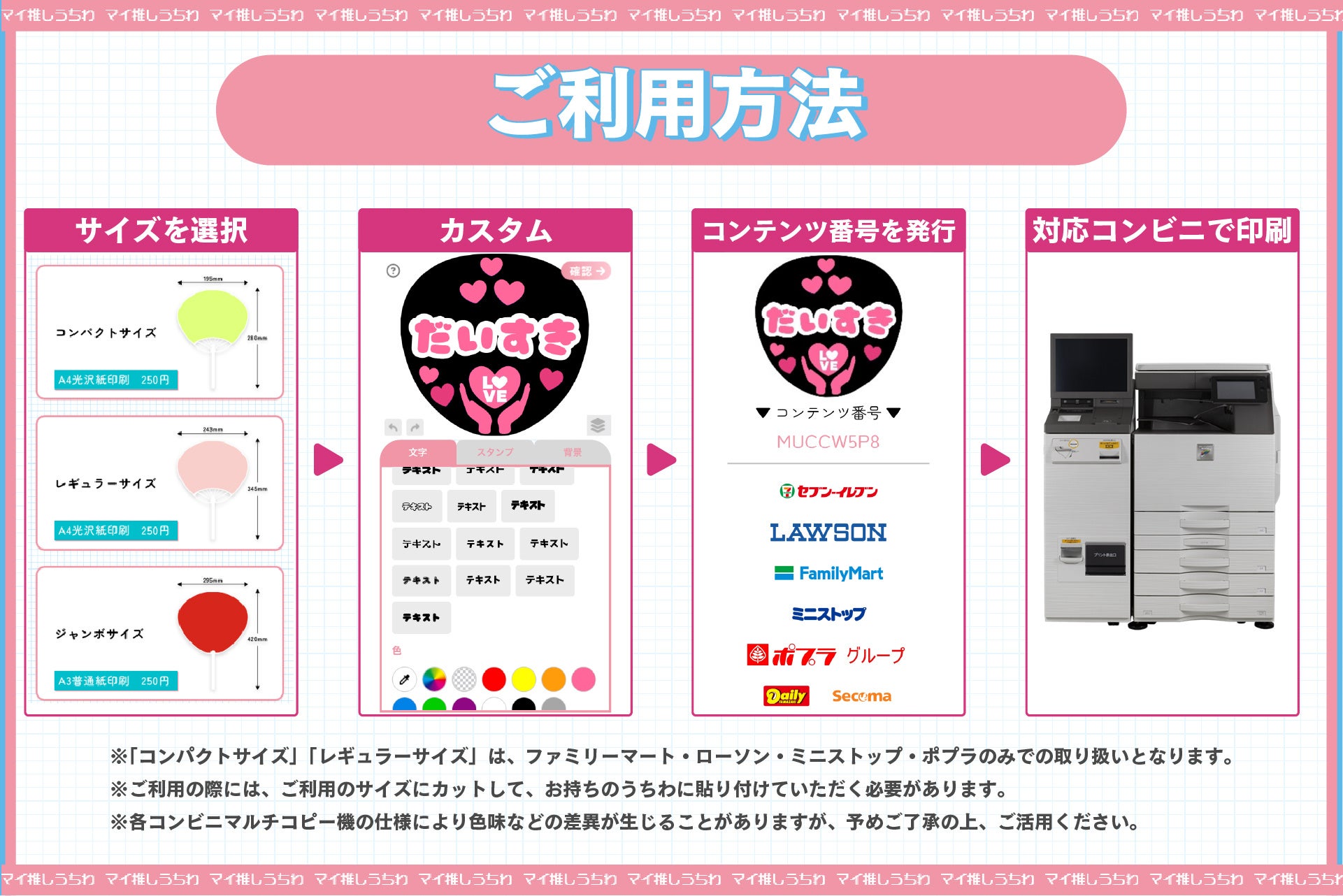 『マイ推しうちわ』は、アイドルやアーティストのライブ参戦時に欠かせない“うちわ”を、スマホやPCで簡単にデザインを作成し、全国のコンビニで即印刷できるWebサービスです。