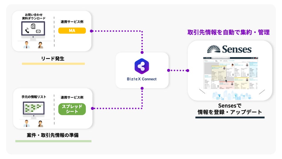 今回リリースしたAPI連携コネクタによって、「BizteX Connect」が既に連携している各SaaSの情報をクラウド営業支援ツール「Senses」に対して自動で登録することが可能になります。