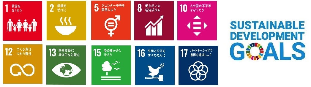 | 目標1 貧困をなくそう 目標2 飢餓をゼロに 目標5 ジェンダー平等を表現しよう 目標8 働きがいも経済成長も 目標10 人や国の不平等をなくそう 目標12 つくる責任 つかう責任 目標13 気候変動に具体的な対策を 目標15 陸の豊かさも守ろう 目標16 平和と公正をすべての人に 目標17 パートナーシップで目標を達成しよう |