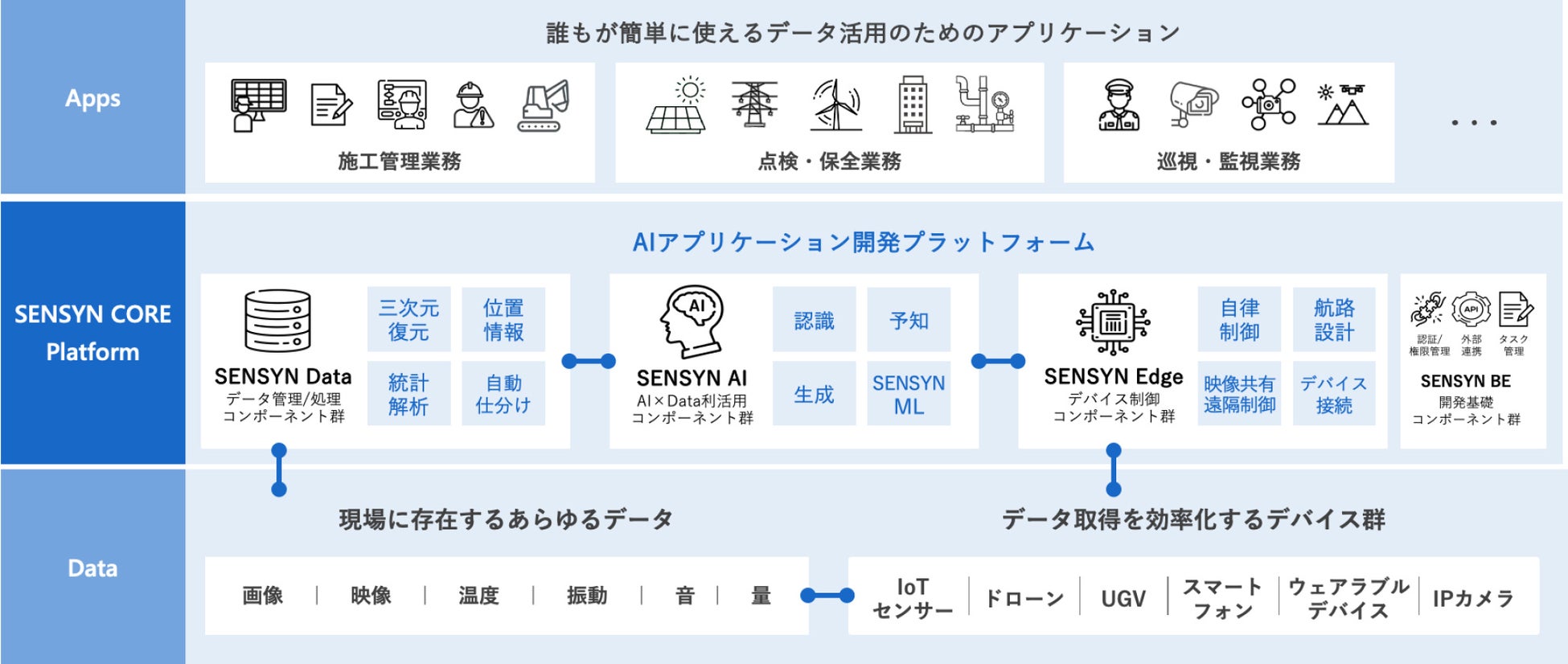 日本、そして世界を支える社会・産業インフラの現場に存在する「労働力不足・安全に対するリスク・上昇するコスト」などの課題を、AIを始めとする最新のテクノロジーを駆使し、誰にでも扱えるデータ利活用のためのソフトウェアソリューションで解決します。 豊富なプロジェクトで得られたノウハウと、独自のソフトウェア開発プラットフォーム「SENSYN CORE」を活用し、コンサルティングからシナリオ策定、ビジネス実現性の評価、技術・システム開発、実業務への定着化まで一気通貫で支援、老朽化するインフラ点検や、少子高齢化による労働人口の減少、激甚化する災害といった社会課題を解決しサステイナブルな未来を実現していきます。
