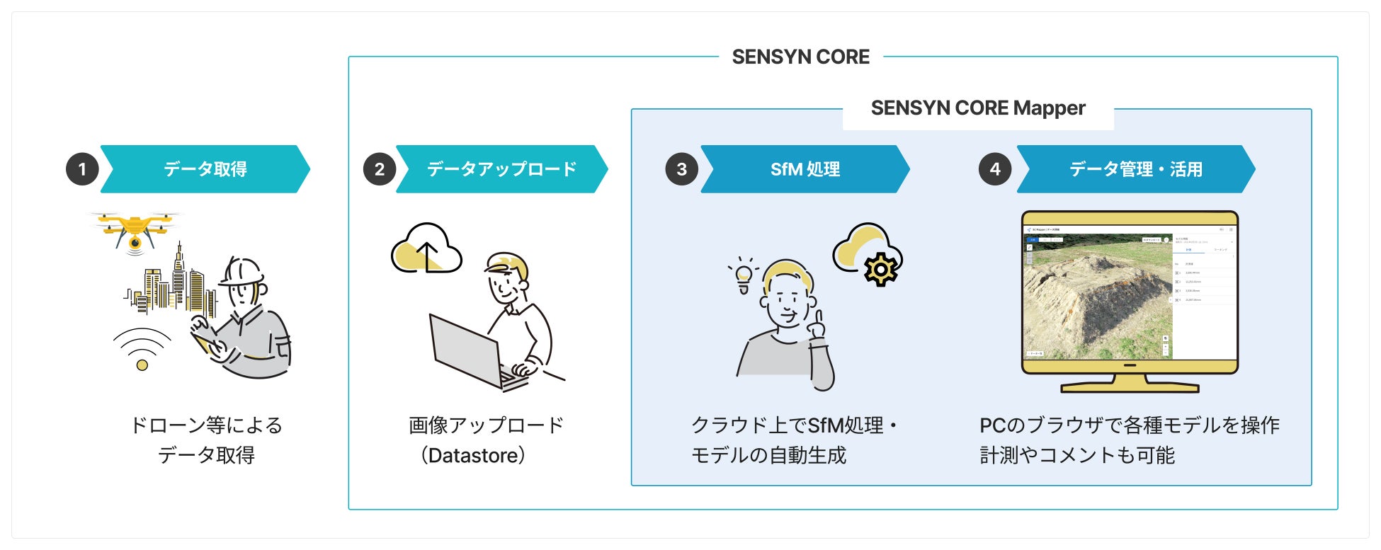 『SENSYN CORE Mapper』は、これらの課題解決へ寄与するサービスです。現場で撮影した複数枚の画像を、データ管理機能を持つ『SENSYN CORE Datastore』にアップロードすることで、自動的に3D点群・3Dモデル・オルソ画像が生成されます。これらの生成物は「建設現場の基礎出来形や土量の計測、ヤード測量、トンネル出来形計測などの様々な計測業務」「リアルタイム状況が反映された3Dモデル・平面画像を活用した現場管理や、職員同士のコミュニケーション」「障害物回避等、実際の現場状況を考慮したドローン等データ取得デバイスの航路設計」など、多様なシーンで活用できます。また、『SENSYN CORE Mapper』はAIアプリケーション開発プラットフォーム『SENSYN CORE』の一機能として提供されるため、個社システムとの連携などを素早く実現することもできます。