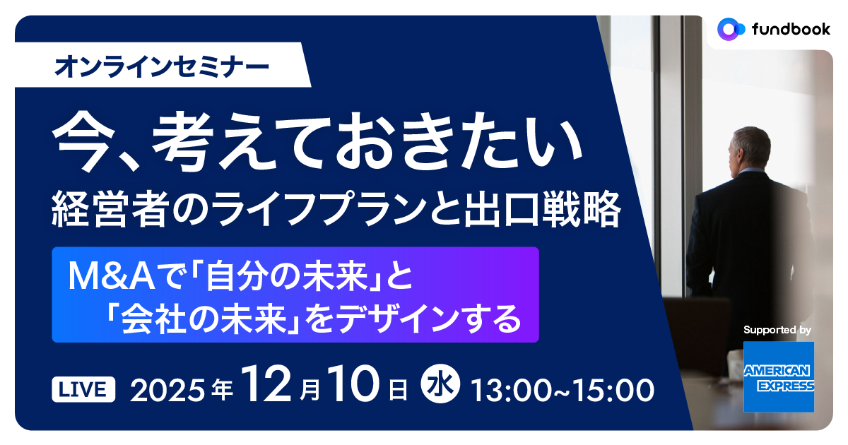 M&A仲介を行う株式会社fundbook(本社:東京都港区、代表取締役: 渡邊和久、読み:ファンドブック、以下「当社」)は、経営者向け無料オンラインセミナーを2025年12月10日(水)に開催いたします。