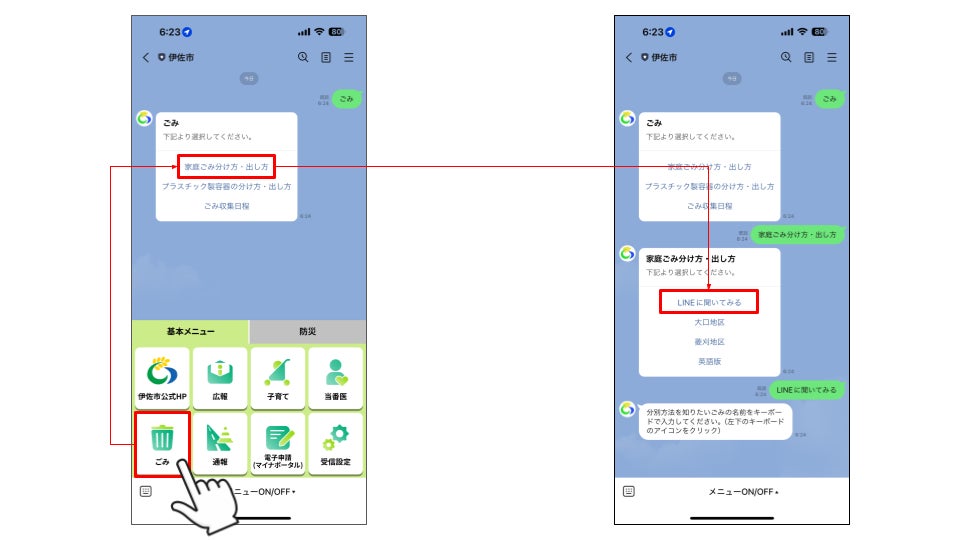 「家庭ごみの分け方・出し方」では、「ごみの一問一答機能」を搭載しております。LINEのトーク画面に直接「ペットボトル」「食品トレイ」などの破棄したいごみの具体名を入力することで、分別方法や捨てる際のコツを自動返答します。