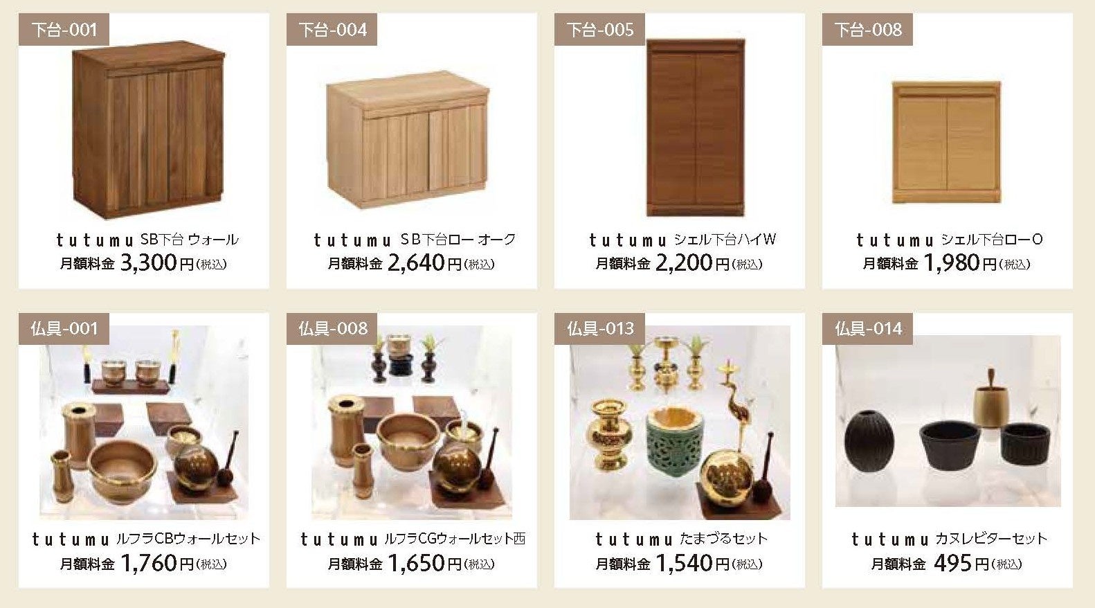 お仏壇とあわせてご利用いただける下台や仏具セットもご用意しています。設置スペースや用途に応じて選べる下台に加え、必要な仏具一式を揃えたセット商品も取り揃えており、お仏壇を初めてご用意される方でも安心してご利用いただけます。また、お仏壇と組み合わせてご利用いただくことで統一感のある空間づくりも可能です。月額605円(税込)から幅広くご用意しており、お客様のご要望やご利用シーンに応じて柔軟にお選びいただけます。