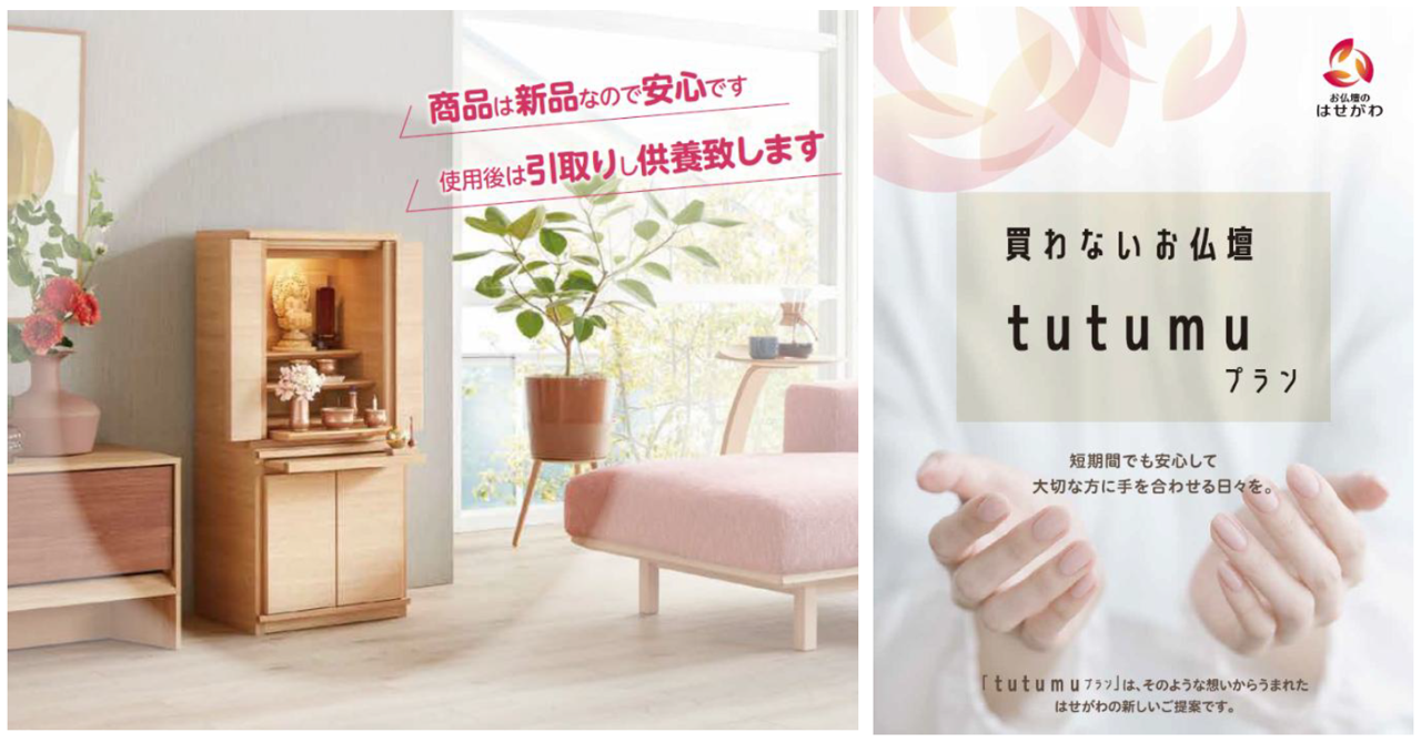 はせがわは、「手を合わせる機会の創造」という理念のもと、費用や住環境などの事情からお仏壇の購入をためらわれるお客様への新たな選択肢として、お仏壇の定額利用サービス「買わないお仏壇『tutumuプラン』」の導入を決定いたしました。