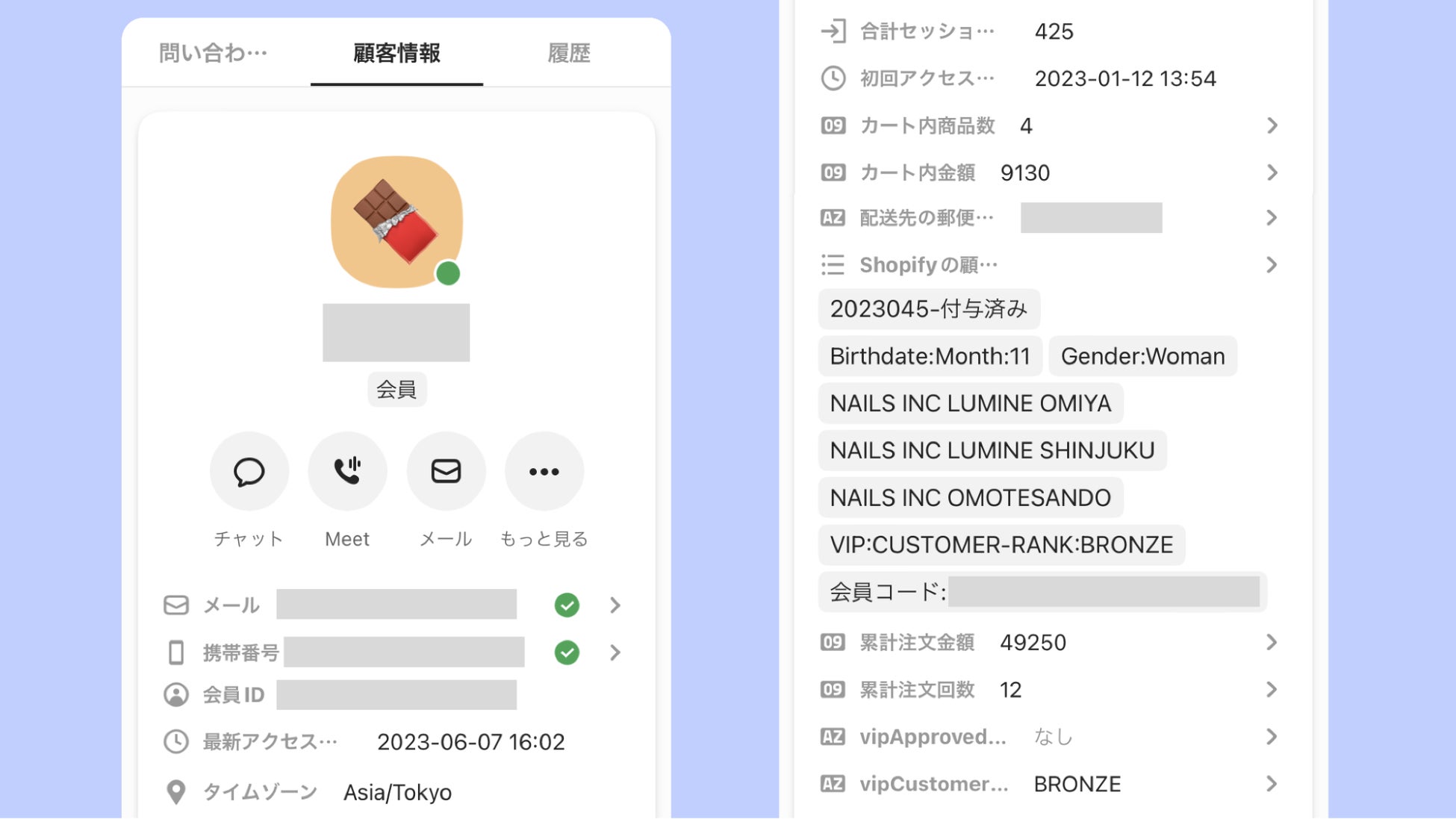 ▲チャネルトーク上での顧客プロフィール情報(実店舗の購買情報とECでの購買情報が連携されているため、スムーズ・売上に繋がる接客が可能)