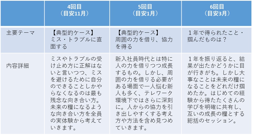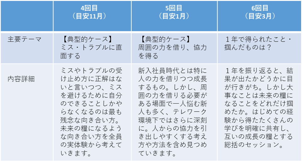 1.オンライン3時間のセッション(6回)で、配属から1年目の終わりまで伴走する