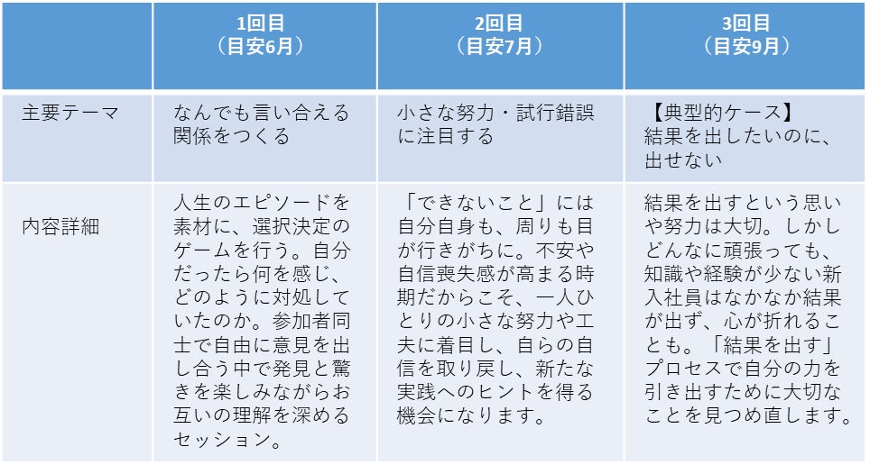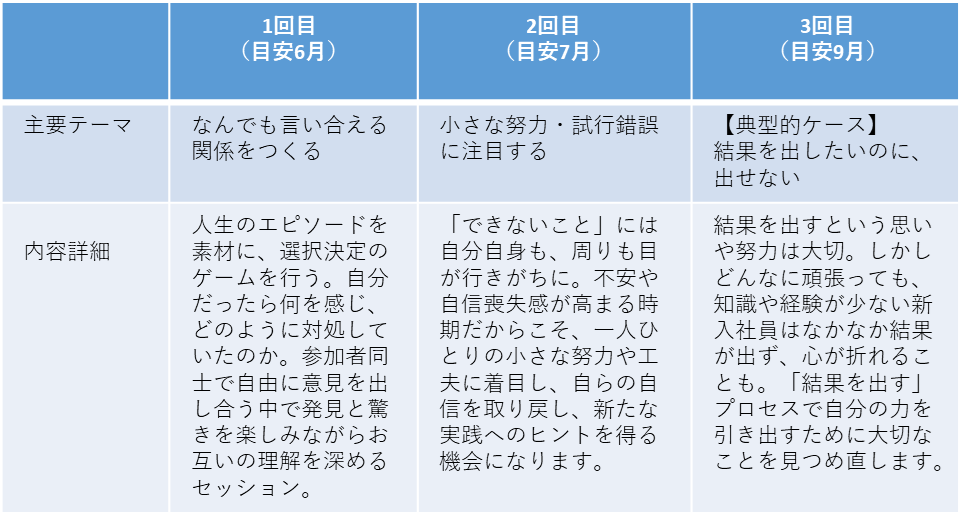 ※職場に配属される時期、実施企業様での状況などを踏まえ、実施時期・回数については調整可能です。