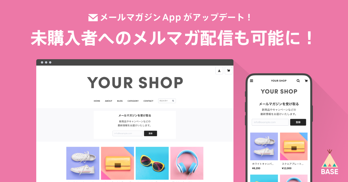 この度、BASE株式会社(所在地:東京都港区、代表取締役CEO:鶴岡 裕太)が運営するネットショップ作成サービス「BASE(ベイス)」は、加盟店の円滑なCRM(Customer Relationship Management)を推進するため、「BASE」加盟店が購入者に向けてメールマガジン(以下、メルマガ)を配信できる拡張機能「メールマガジン App」を2022年1月17日(月)にアップデートしました。本アップデートにより、これまで配信できなかった未購入者に対するメルマガ配信が可能になりました。