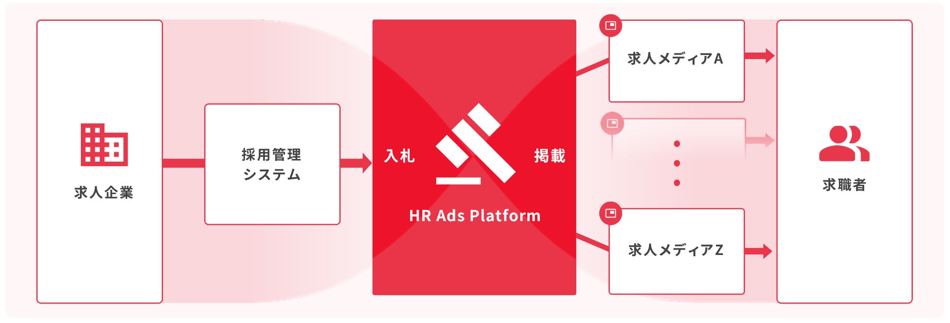 HRアドプラットフォームは多数の求人メディアと連携し、求人を出したい企業と求人を掲載したいメディアをアドテクノロジーでマッチングします。応募課金モデルとなっており、入札時に設定した予算や応募単価によって求人メディアに掲載される際の掲載位置が変動するため、企業側の望んだ単価で応募獲得が可能です。企業はHRアドプラットフォームを利用することで、求人にまつわる業務(掲載求人メディアの選定、求人原稿作成、出稿、応募者管理、効果確認改善など)を一つのサービスで完結できるほか、採用にかかるコストを最適化し、採用担当者の求人業務DX化を推進します。