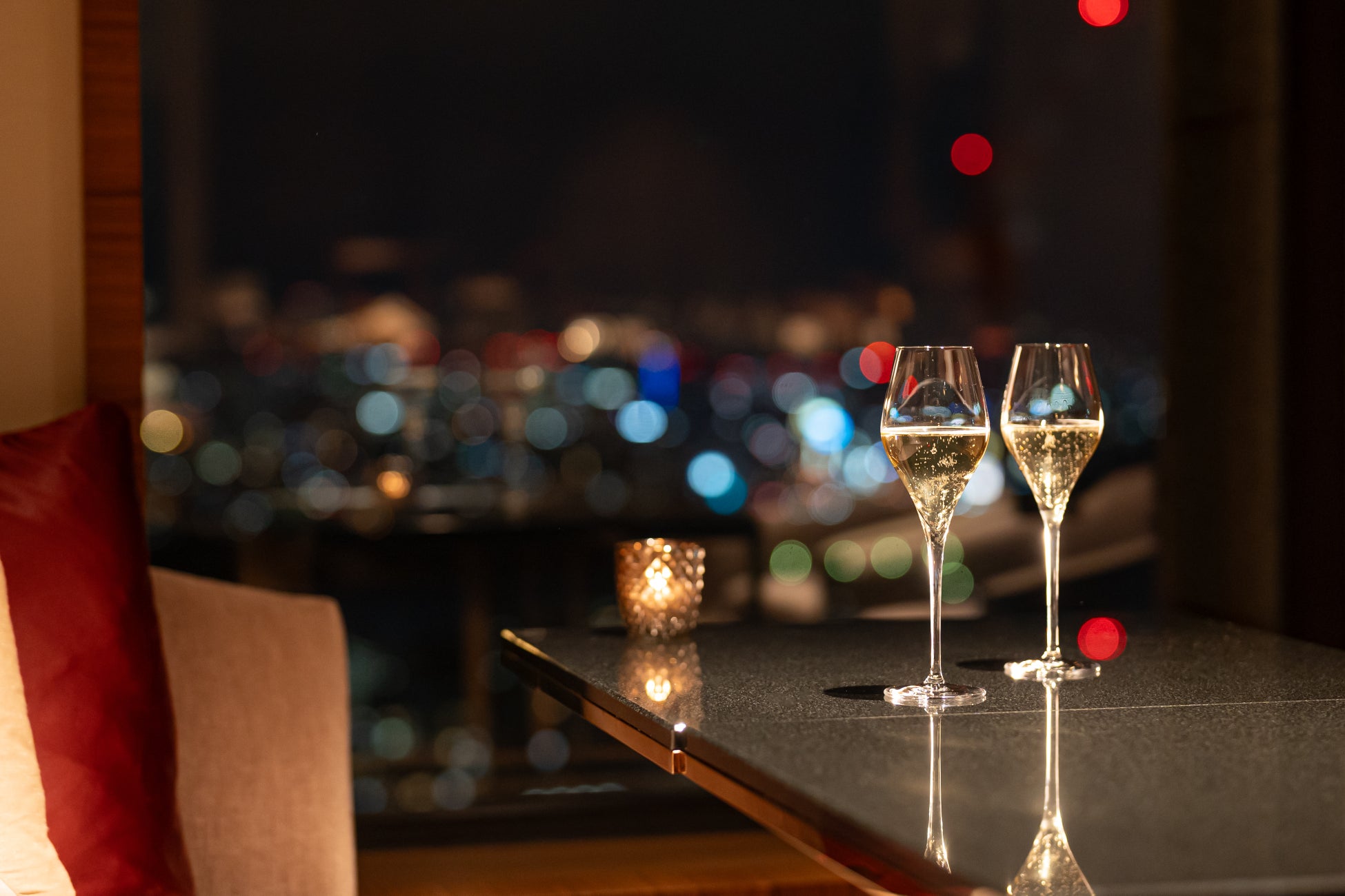 夕暮れから夜にかけて、より夜景がお楽しみいただけるライティングにて、優雅なカクテルタイムを提供しております。シャンパンやカクテルなど、お好みのドリンクをカナッペとともにお楽しみいただけます。