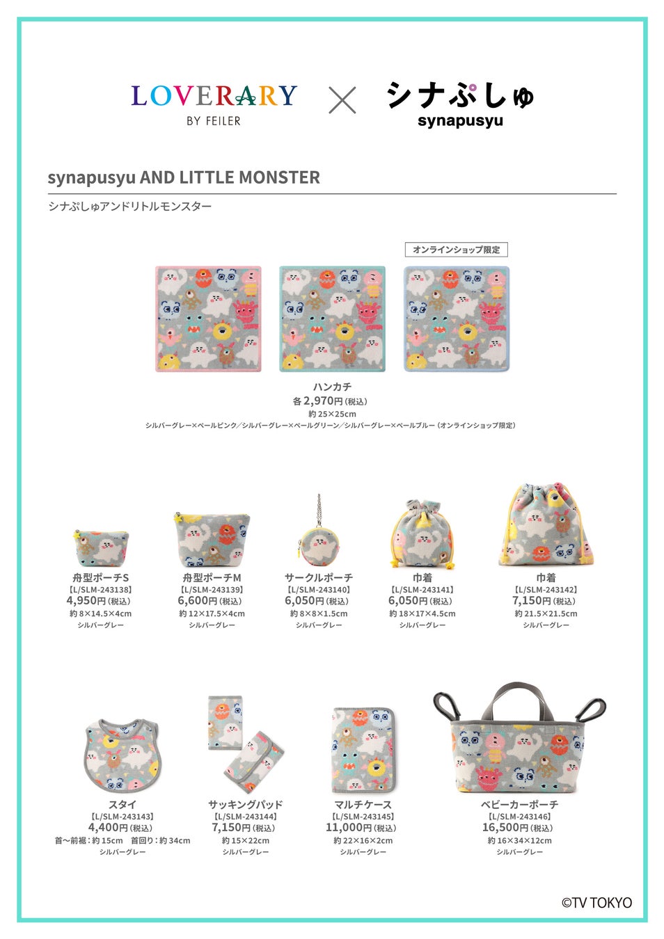 「シナぷしゅ」とラブラリー バイ フェイラーが初のコラボレーション。「シナぷしゅ」は、テレビ東京系列にて毎週月曜~金曜あさ放送中の、乳幼児向け番組です。「シナぷしゅ」の人気キャラクター「ぷしゅぷしゅ」と「そらのライオン」が、ラブラリー バイ フェイラーの人気デザイン『リトルモンスター』に登場!“かわいい”がいっぱいのコラボレーションをお楽しみください。