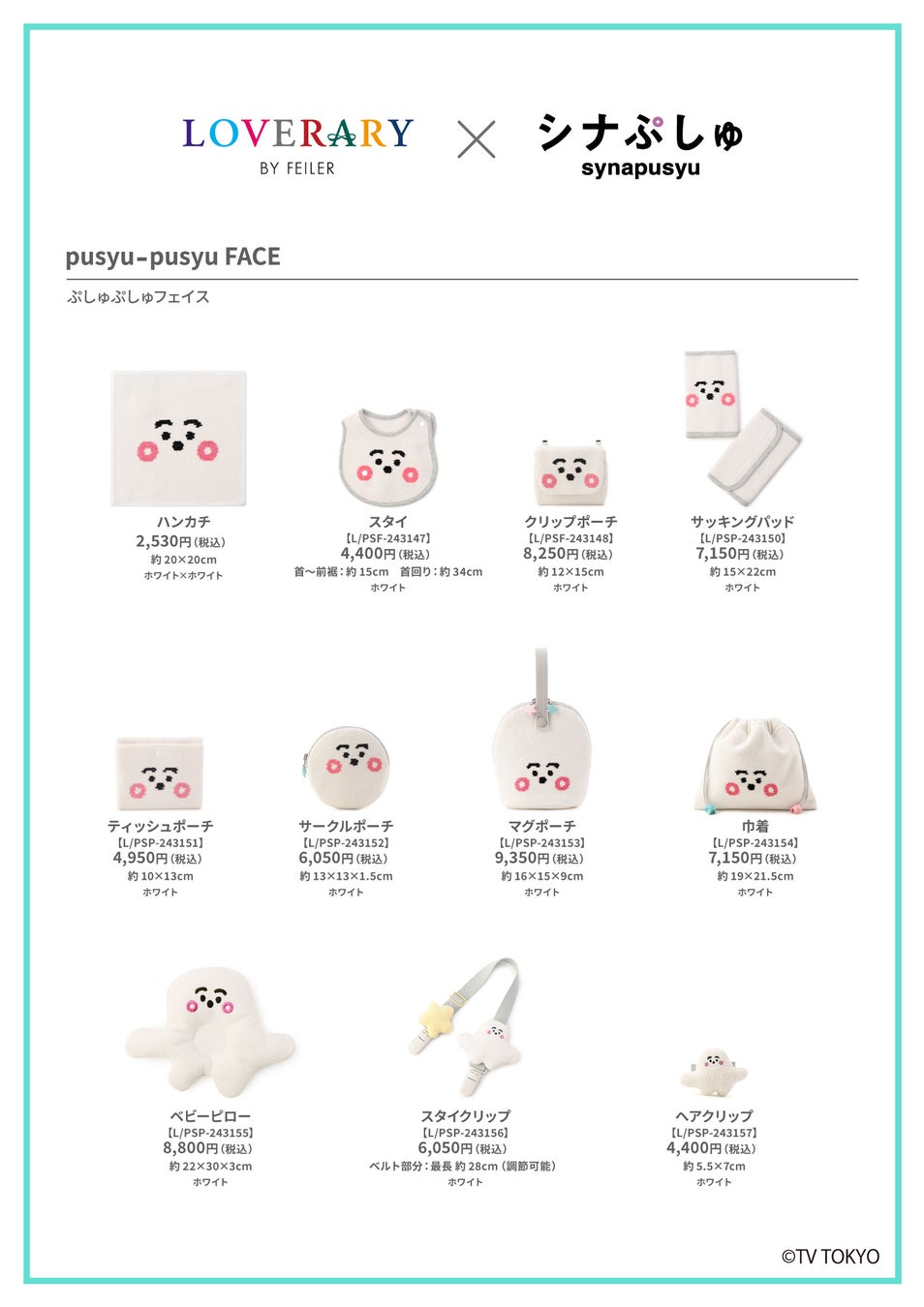 「シナぷしゅ」とラブラリー バイ フェイラーが初のコラボレーション。「シナぷしゅ」は、テレビ東京系列にて毎週月曜~金曜あさ放送中の、乳幼児向け番組です。「シナぷしゅ」の人気キャラクター「ぷしゅぷしゅ」の顔を大きくデザイン!優しくてあたたかくてとっても柔らかい「ぷしゅぷしゅ」に見つめられると思わず笑顔に。かわいくて癒されるコラボレーションをお楽しみください。