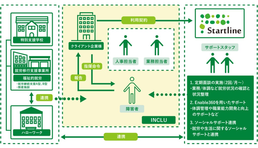 「自分をおもいやり、人をおもいやり、その先をおもいやる。」の企業理念のもと、2009年創業以来、障害者雇用支援の領域において障害者の「採用」と「定着」に重きを置き、障害者雇用支援サービスサポート付きサテライトオフィス「INCLU」を運営。障害者雇用に関する総合コンサルティングを軸に、屋内農園型障害者雇用支援サービス「IBUKI」、ロースタリー型障害者雇用支援サービス 「BYSN」、企業/障害当事者向けカスタマイズ研修、在宅雇用支援、障害者採用支援などサービスメニューを拡充しています。一つでも多くの選択肢をつくり、多様な人々の可能性を拡張することで、誰もが自分らしく生きる社会を目指しています。