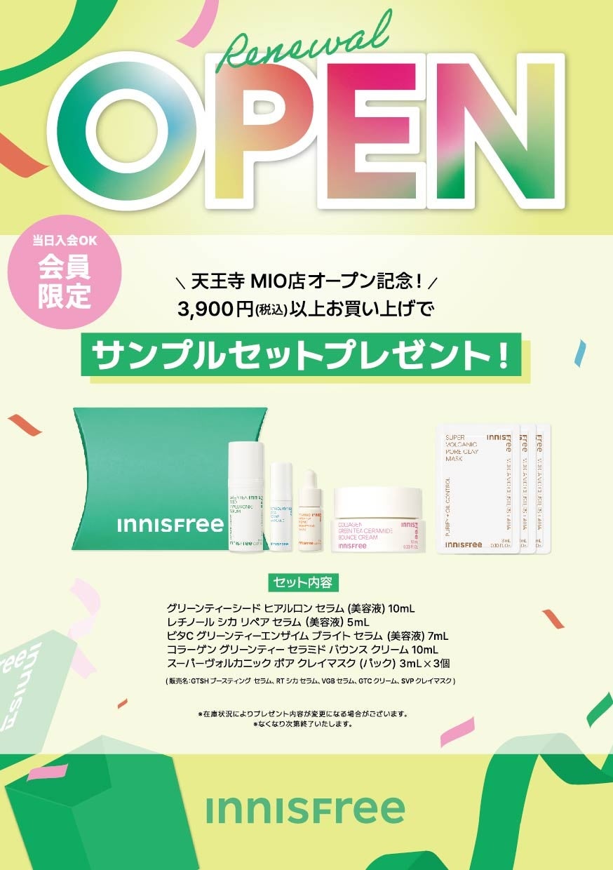 「イニスフリー 天王寺MIO店」では、オープンを記念してキャンペーンを開催。