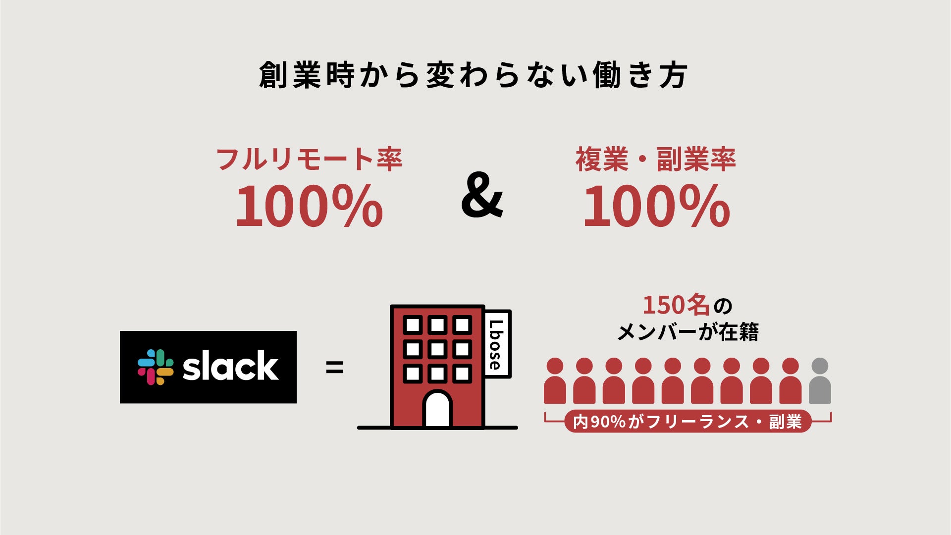 働き方は創業時から今まで変わらず、フルリモート、復業・副業率が100%です。