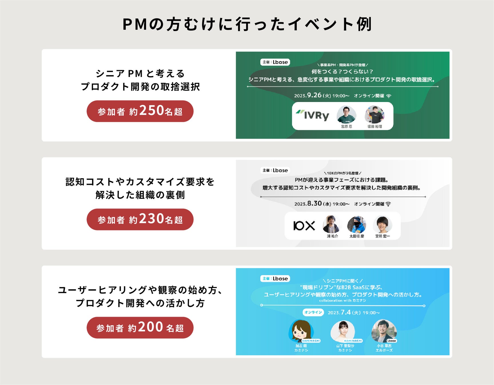 イベントは毎回PMの興味関心に合わせた企画をたて、最も賑わったイベントでは250名以上にご参加いただきました。