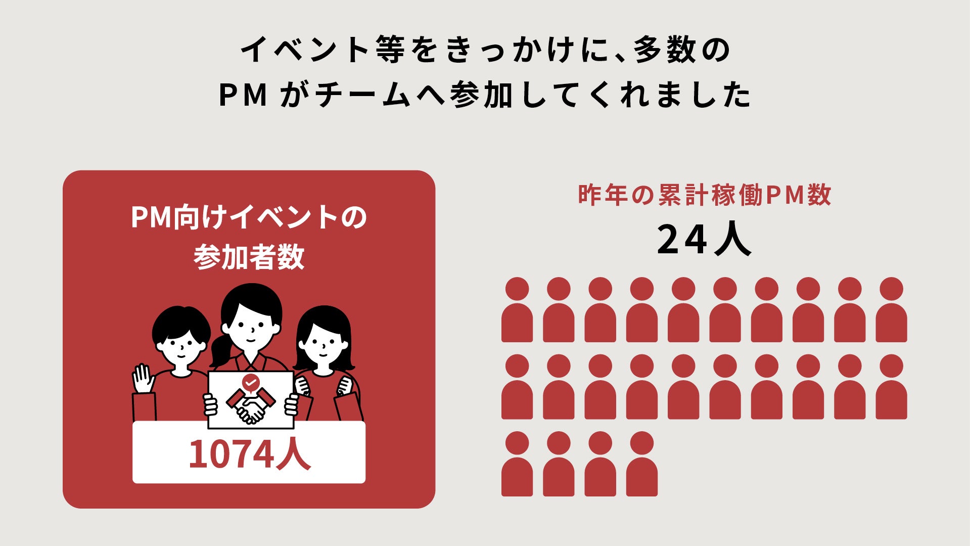 PMは採用が難しい職種として知られていますが、エルボーズ独自の制度による働きやすい環境整備や、PMの方向けのイベントを複数開催することで、開催したイベントでは合計1000名以上のPM・PM関係者に参加いただきました。これらのイベントを通し多数のPMに組織に参画いただき、ATTEND biz4年目の昨年は合計24名のPMに稼働いただきました。