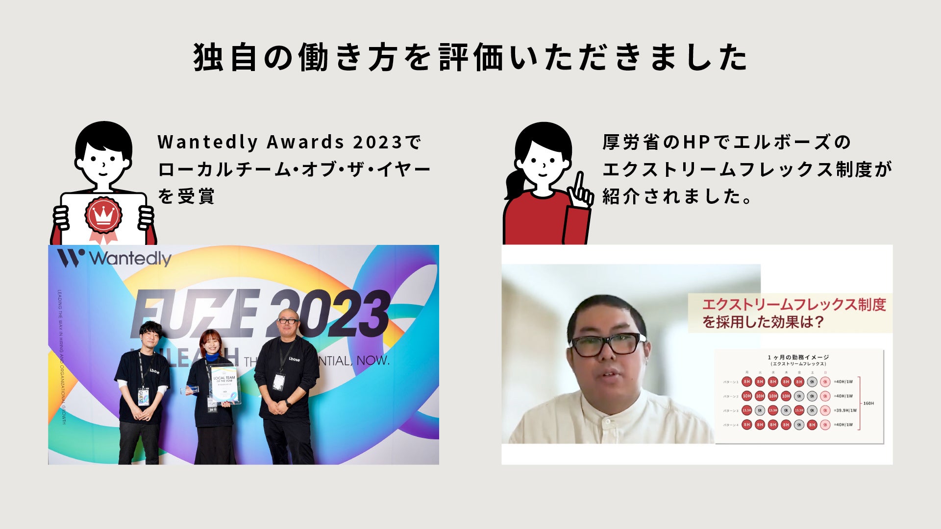 エルボーズ独自の働き方を評価いただき「Wantedly Awards 2023」では、非首都圏企業において成果を上げた企業に贈られる賞「ローカルチーム・オブ・ザ・イヤー(Local Team of the year)」を受賞しました。