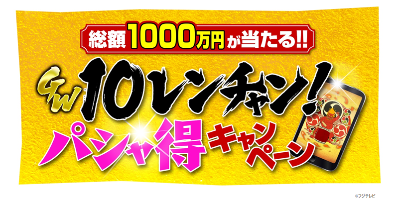 株式会社フジテレビジョン(本社:東京都港区/代表取締役社長:金光 修)では「10レンチャン!パシャ得キャンペーン」を4月29日(金)から5月8日(日)まで開催。本キャンペーンでは、ゴールデンウィークの10日間にフジテレビ系列で放送する対象番組をリアルタイムで視聴し、番組放送中にスマートフォンでテレビ画面を撮影することで、抽選で合計5,000名様にQUOカードPay1,000円分がその場で当たるスクラッチくじ「パシャスクラッチ」に挑戦できます。スクラッチくじで「はずれ」が出た場合も、「鬼」スタンプをプレゼント。「鬼」スタンプを10個貯めることで、500名様にQUOカードPay10,000円分が当たる「10レンチャンス」に応募することができます。