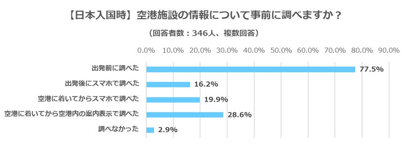 「出発前に調べた」と回答した人が77.5%:268人と最も多い結果となりました。8割近くの旅行者が日本の空港にあるさまざまな施設について、調査を行った上で出発していることがわかりました。また、事前に調査はしなかったものの、「出発後にスマホで調べた(日本到着前まで)」と回答した人は16.2%:56人、「空港に着いてからスマホで調べた」と回答した人が19.9%:69人でした。