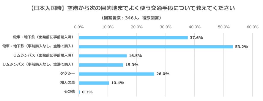 電車・地下鉄については、「出発前に事前にチケット購入済」と回答した人は37.6%:130人、「空港で購入(事前購入なし)」と回答した人は53.2%:184人で、多くの人が電車・地下鉄を利用していることがわかりました。